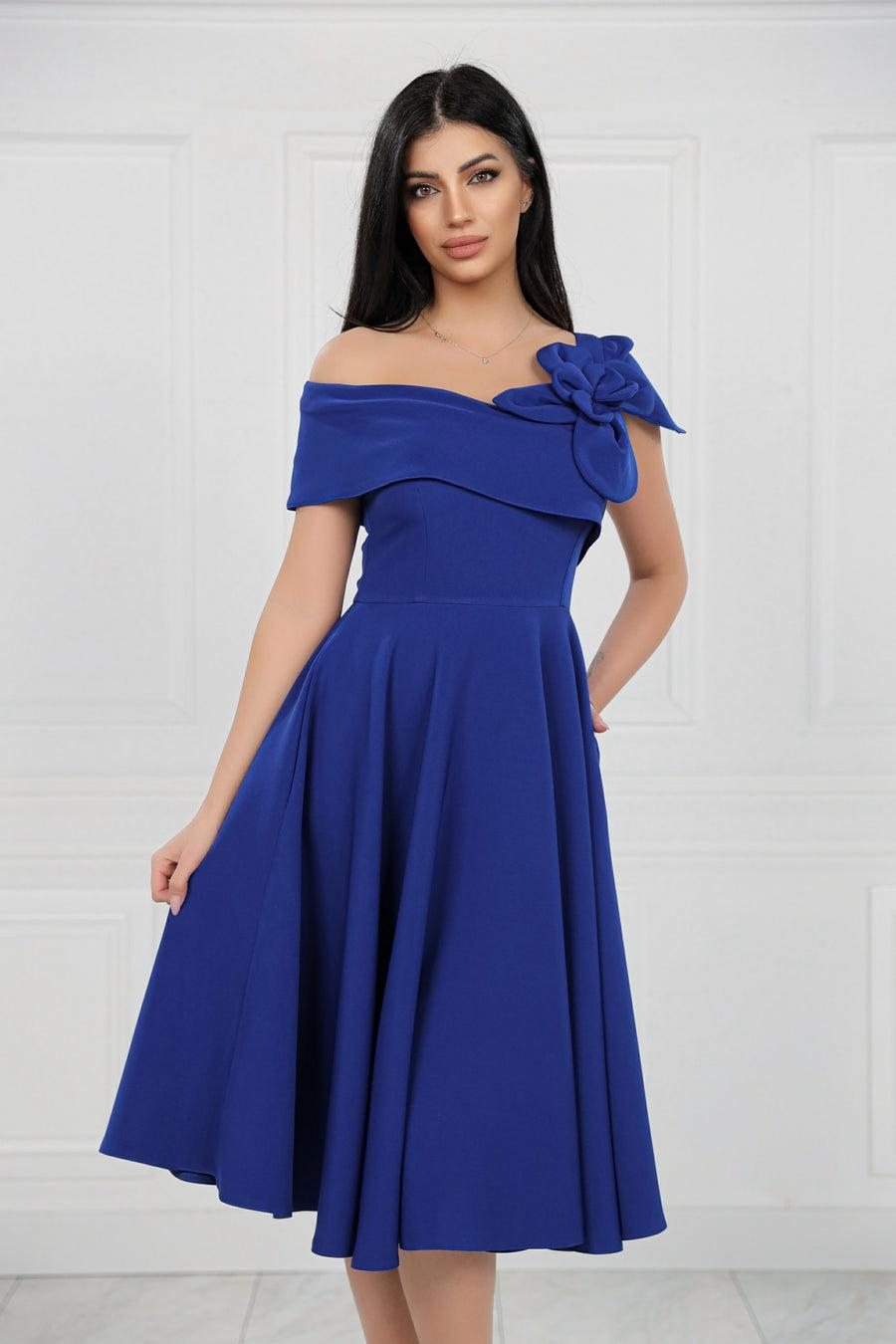 Rochie elegantă albastru regal, cu croială midi și design asimetric, ideală pentru evenimente speciale.